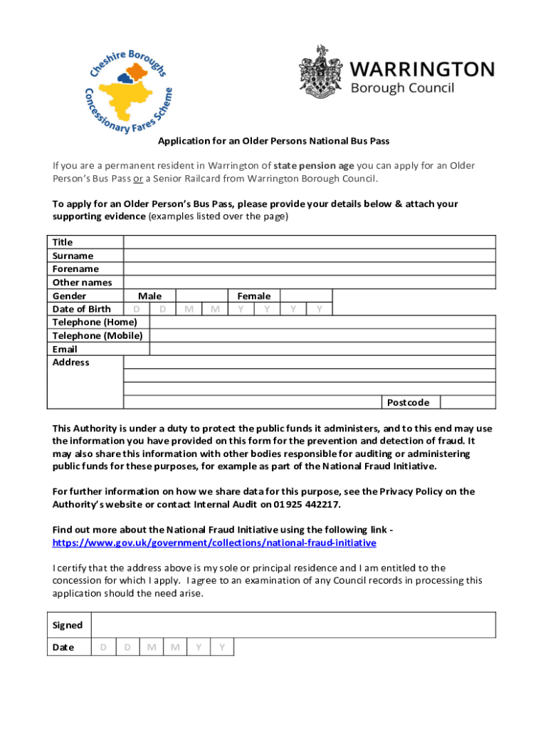 Application for an Older Persons National Bus Pass If you are a permanent resident in Warrington of state pension age you can apply for an Older Persons Bus Pass or a Senior Railcard from Warrington