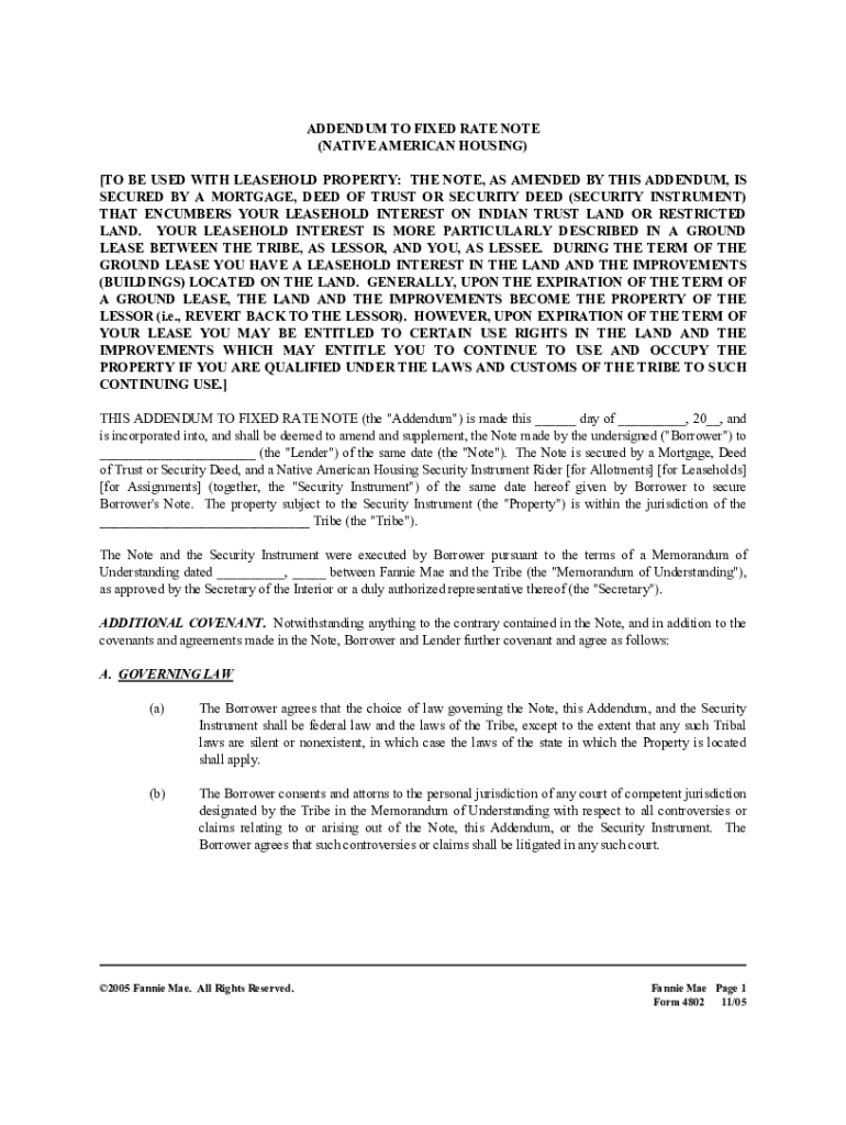 ADDENDUM TO FIXED RATE NOTE (NATIVE AMERICAN HOUSING) [TO BE USED WITH LEASEHOLD PROPERTY: THE NOTE, AS AMENDED BY THIS ADDENDUM, IS SECURED BY A MORTGAGE, DEED OF TRUST OR SECURITY DEED (SECURITY