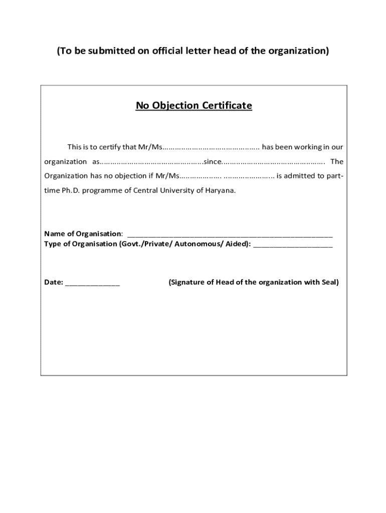(To be submitted on official letter head of the organization)No Objection Certificates is to certify that Mr/Ms.............................................. has been working in our organization as.................................................since.................................................