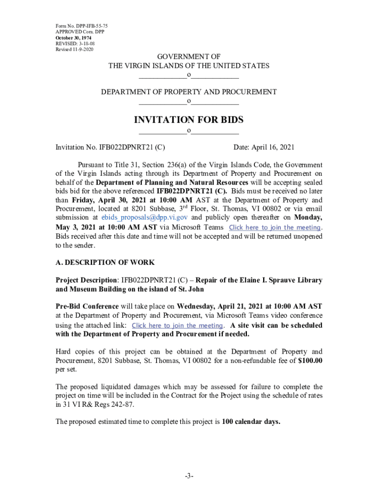 Form No. DPPIFB5575 APPROVED Com. DSP October 30, 1974, REVISED: 31808 Revised 1192020GOVERNMENT OF THE VIRGIN ISLANDS OF THE UNITED STATES ___o___DEPARTMENT OF PROPERTY AND PROCUREMENT ___o___INVITATION