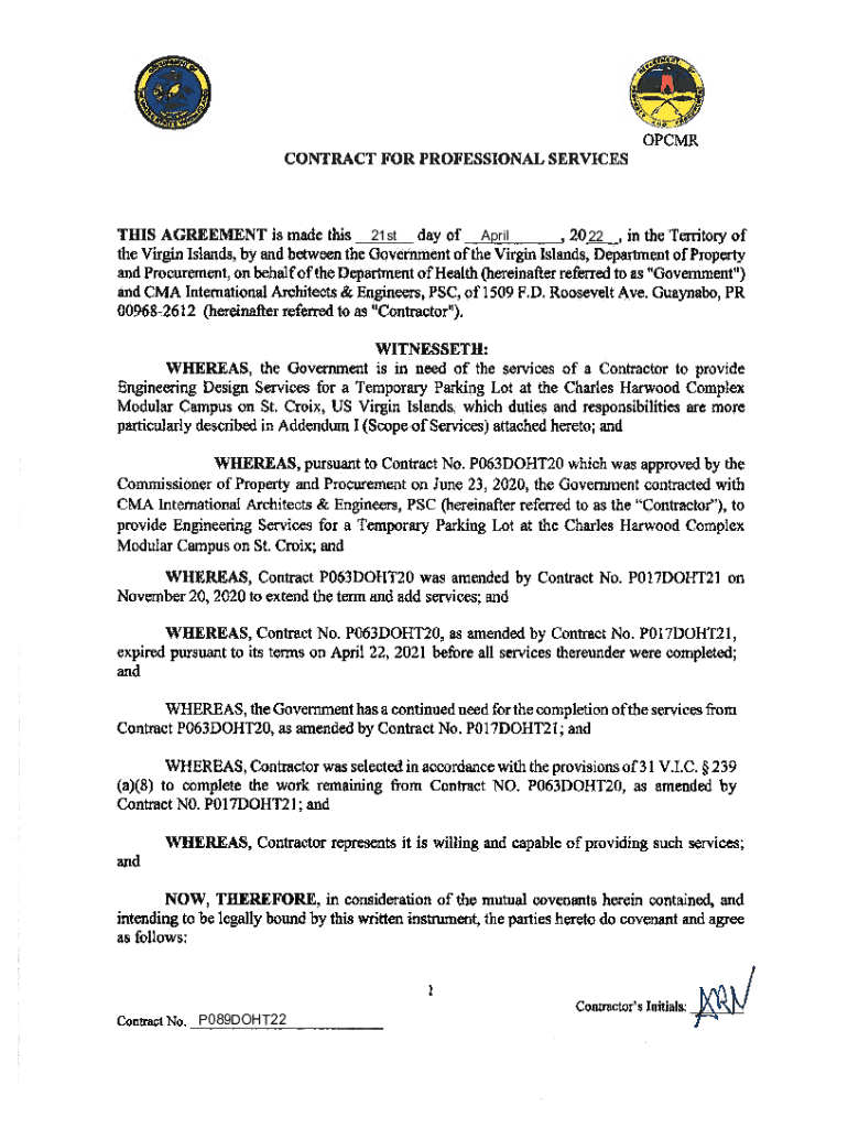 ______, ___OP CMR CONTRACT FOR PROFESSIONAL SERVICESTHIS AGREEMENT is made this 21st day of April 20 22 in the Territory of the Virgin Islands, by and between the Government of the Virgin Islands,