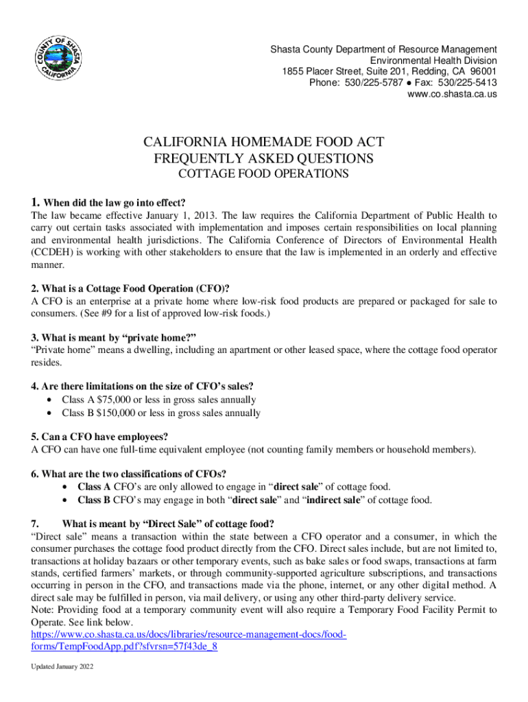 Shasta County Department of Resource Management Environmental Health Division 1855 Placer Street, Suite 201, Redding, CA 96001 Phone: 530/2255787 Fax: 530/2255413 www.co.shasta.ca.usCALIFORNIA HOMEMADE