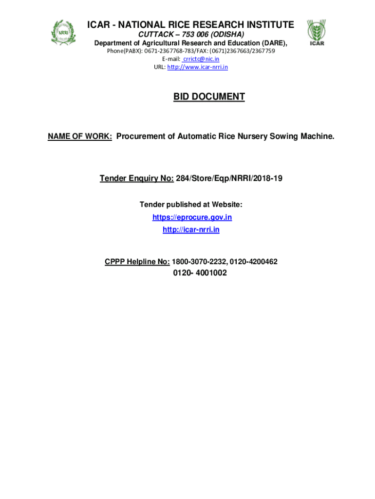 Get the free NAME OF WORK: Procurement of Automatic Rice Nursery Sowing Machine