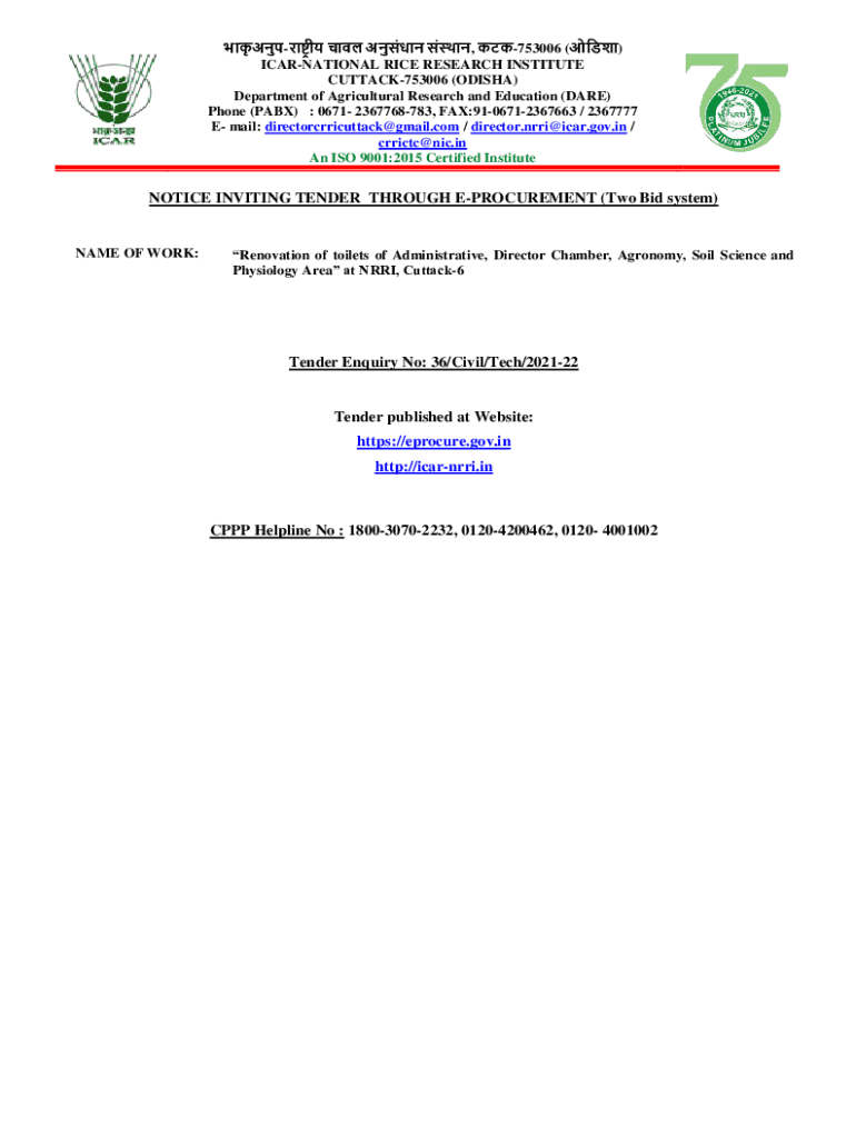Get the free NOTICE INVITING TENDER THROUGH E ... - ICAR-NRRI
