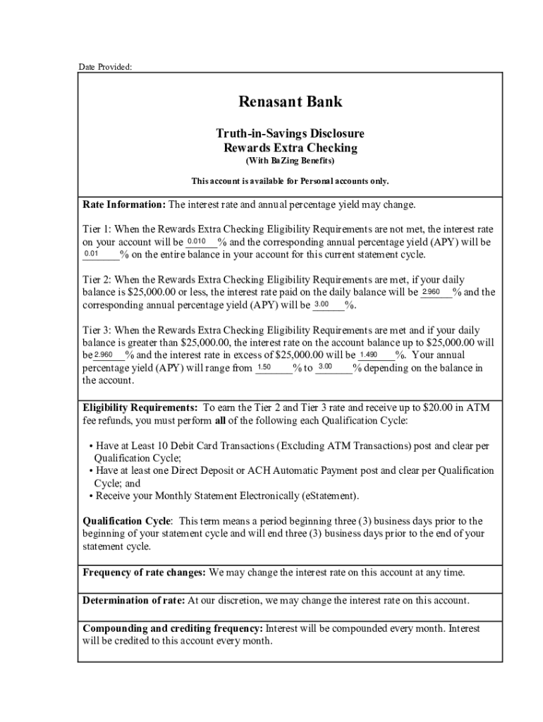 Date Provided:Peasant Bank TruthinSavings Disclosure Rewards Extra Checking (With Beijing Benefits)This account is available for Personal accounts only. Rate Information: The interest rate and annual