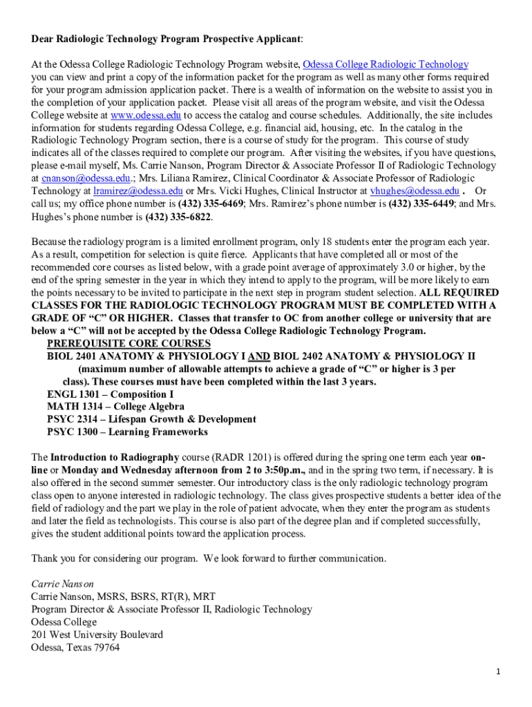 Dear Radiologic Technology Program Prospective Applicant: At the Odessa College Radiologic Technology Program website, Odessa College Radiologic Technology you can view and print a copy of the information