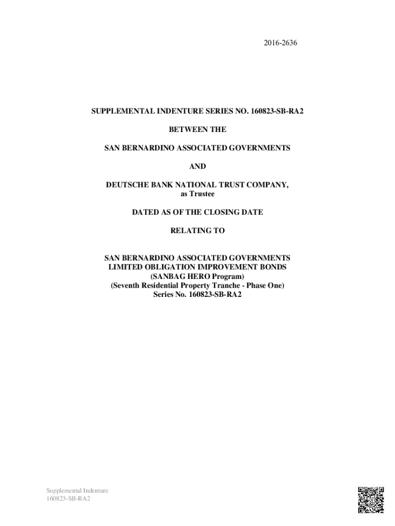 20162636SUPPLEMENTAL INDENTURE SERIES NO. 160823SBRA2 BETWEEN THE SAN BERNARDINO ASSOCIATED GOVERNMENTS AND DEUTSCHE BANK NATIONAL TRUST COMPANY, as Trustee DATED AS OF THE CLOSING DATE RELATING TO