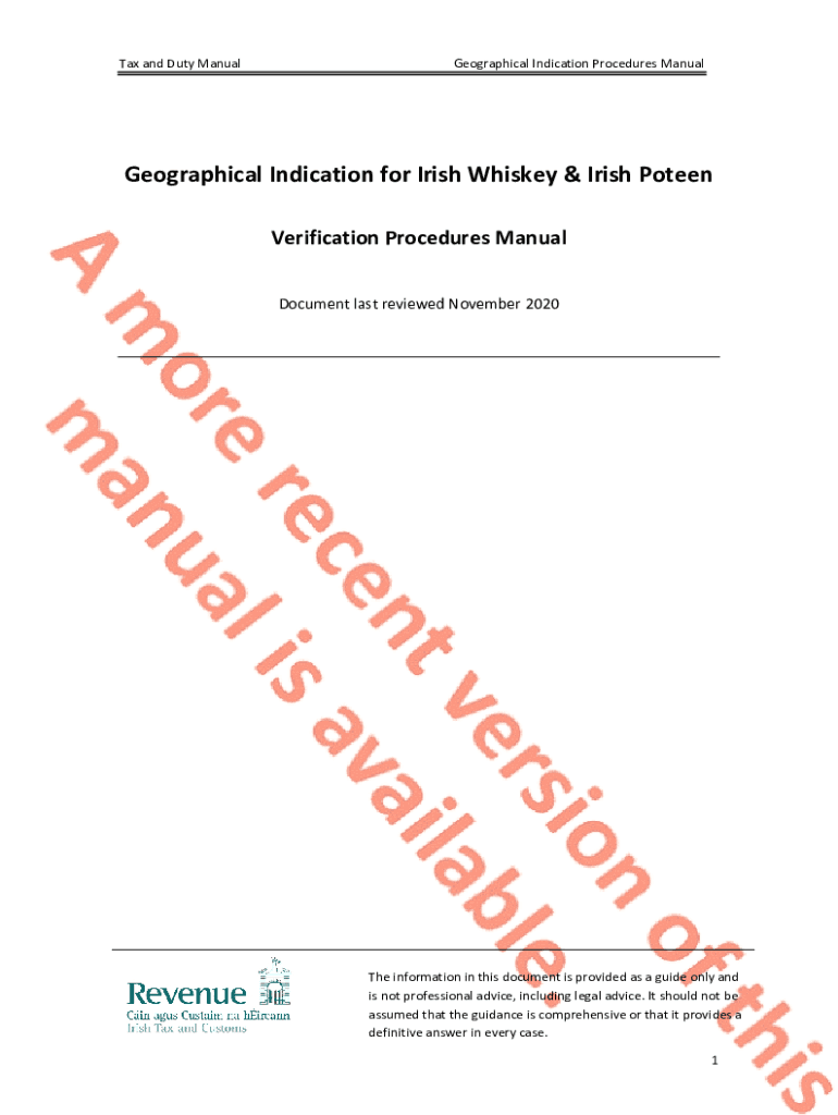 Tax and Duty ManualGeographical Indication Procedures ManualGeographical Indication for Irish Whiskey & Irish Po teen Verification Procedures Manual Document last reviewed November 2020The information
