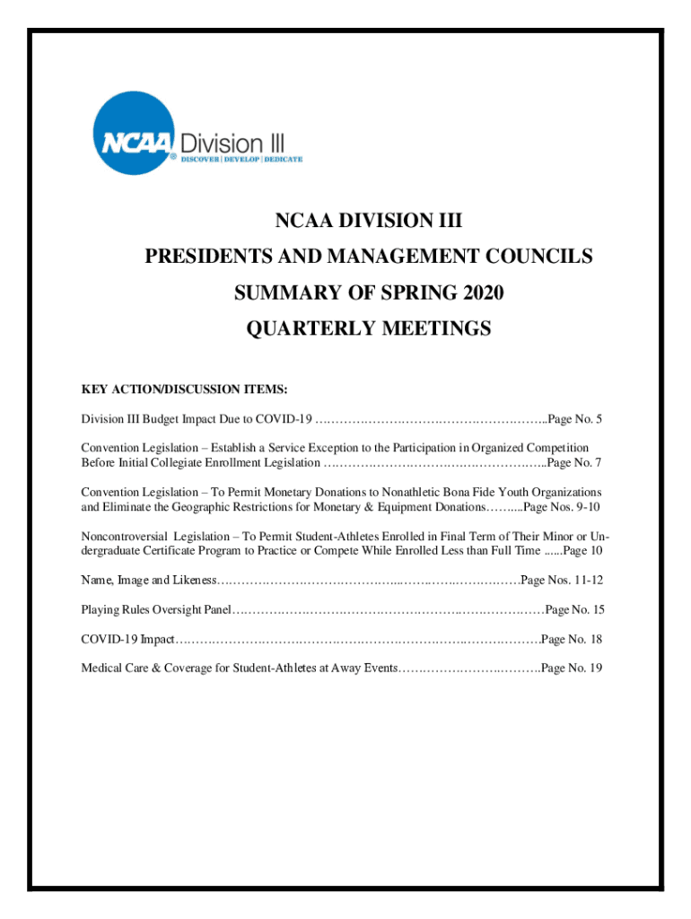 NCAA DIVISION III PRESIDENTS AND MANAGEMENT COUNCILS SUMMARY OF SPRING 2020 QUARTERLY MEETINGS KEY ACTION/DISCUSSION ITEMS: Division III Budget Impact Due to COVID-19 ... Page No. 5 Convention Legislation