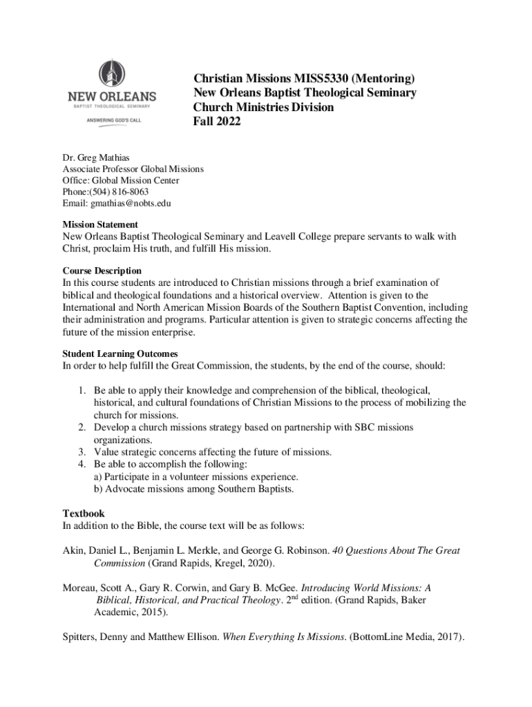 Christian Missions MISS5330 (Mentoring) New Orleans Baptist Theological Seminary Church Ministries Division Fall 2022 Dr. Greg Mathias Associate Professor Global Missions Office: Global Mission Center