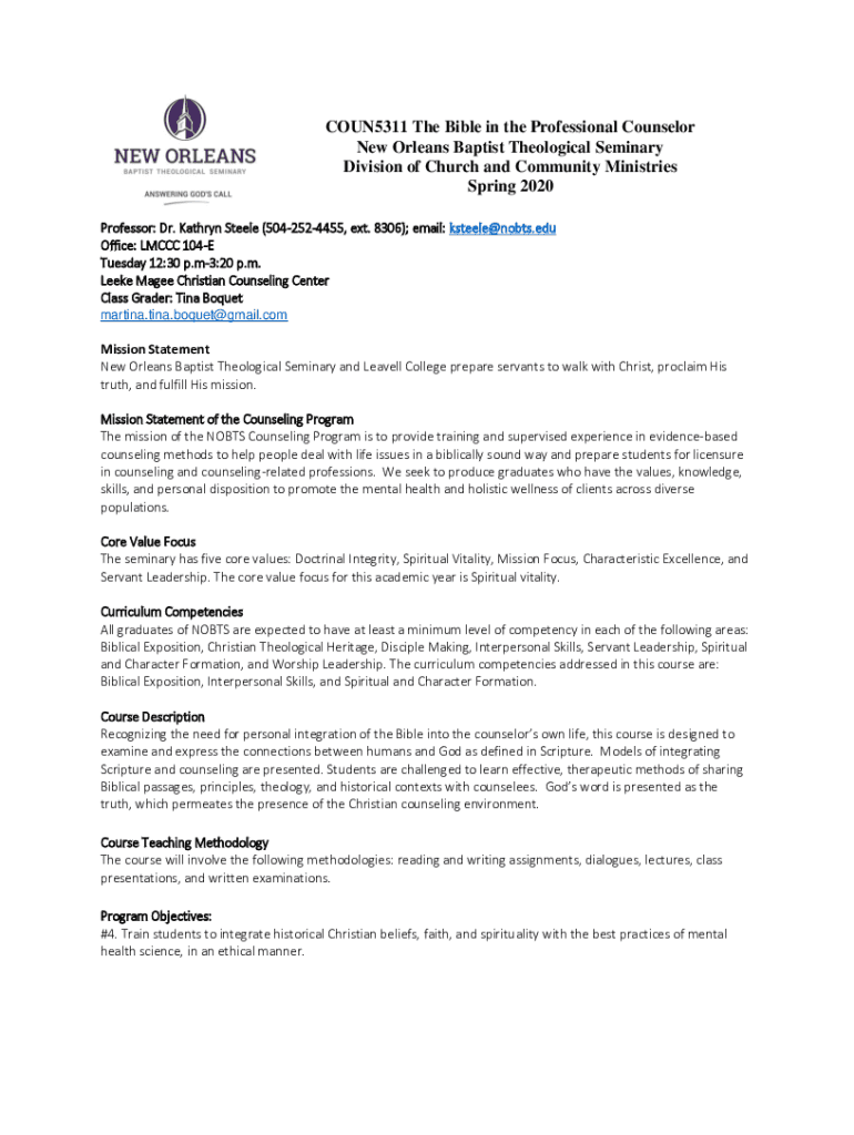 COUN5311 The Bible in the Professional Counselor New Orleans Baptist Theological Seminary Division of Church and Community Ministries Spring 2020 Professor: Dr. Kathryn Steele (5042524455, ext. 8306);