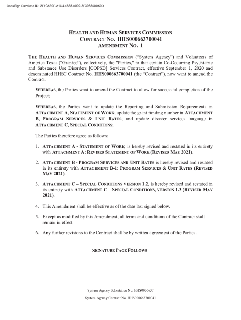 HEALTH AND HUMAN SERVICES COMMISSION CONTRACT NO. HHS000663700041 AMENDMENT NO. 1 THE HEALTH AND HUMAN SERVICES COMMISSION (System Agency) and Volunteers of America Texas (Grantee), collectively,