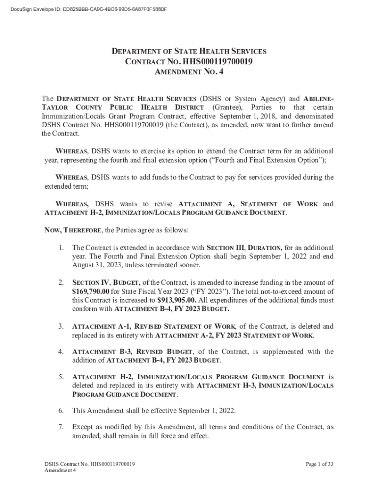 DEPARTMENT OF STATE HEALTH SERVICES CONTRACT NO. HHS000119700019 AMENDMENT NO. 4 The DEPARTMENT OF STATE HEALTH SERVICES (DSS or System Agency) and ABILENETAYLOR COUNTY PUBLIC HEALTH DISTRICT (Grantee),