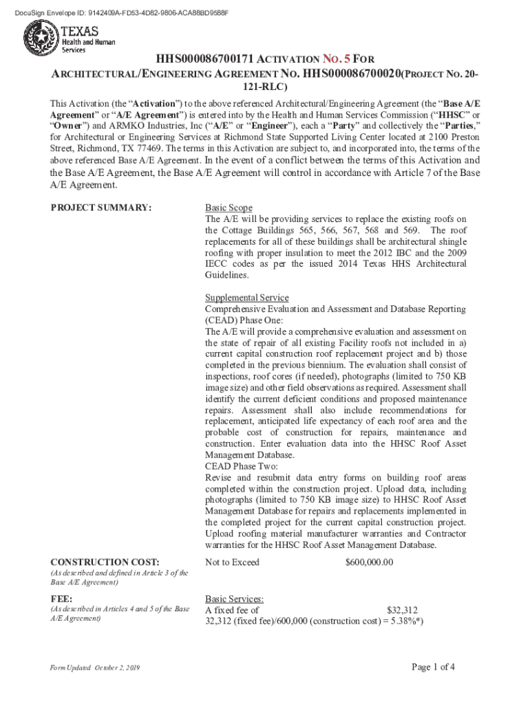 HHS000086700171 ACTIVATION NO. 5 FOR ARCHITECTURAL/ENGINEERING AGREEMENT NO. HHS000086700020(PROJECT NO. 20121RLC) This Activation (the Activation) to the above referenced Architectural/Engineering