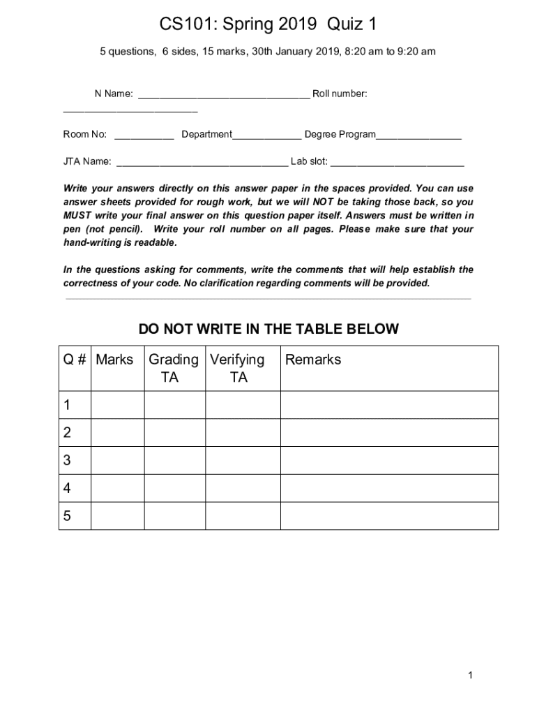 CS101: Spring 2019 Quiz 1 5 questions, 6 sides, 15 marks, 30th January 2019, 8:20 am to 9:20 am N Name: ___ Roll number: ___ Room No: ___ Department___ Degree Program___ JTA Name: ___ Lab slot: ___