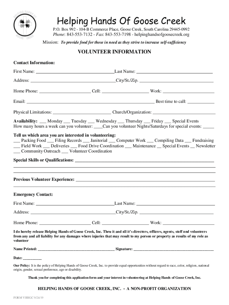Helping Hands Of Goose Creek P.O. Box 992 104B Commerce Place, Goose Creek, South Carolina 294450992Phone: 8435537132 Fax: 8435537198 helpinghandsofgoosecreek.org Mission: To provide food for those