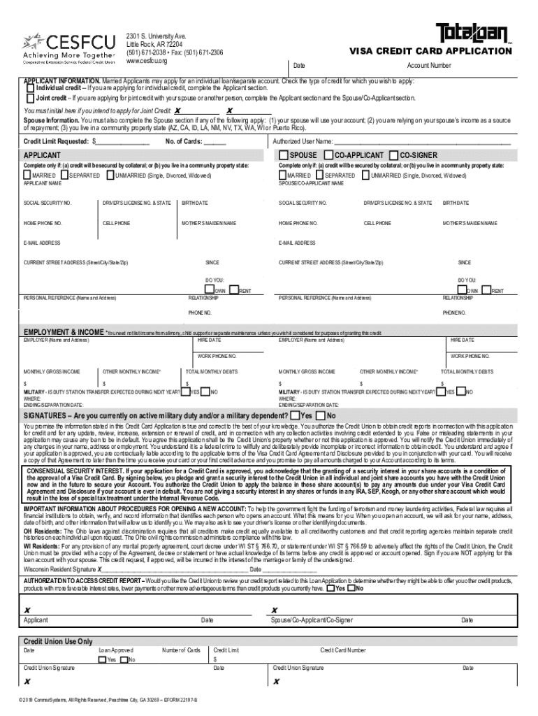 Tnta&an2301 S. University Ave. Little Rock, AR 72204 (501) 6712038 Fax: (501) 6712306 www.cesfcu.orgVISA CREDIT CARD APPLICATION DateAccount NumberAPPLICANT INFORMATION. Married Applicants may apply