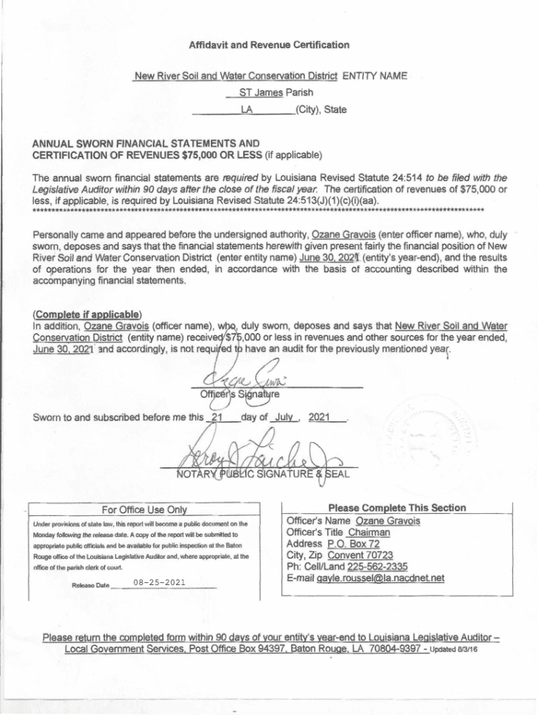 Affidavit and Revenue Certification New River Soil and Water Conservation District ENTITY NAME ST James Parish LA(City), StateANNUAL SWORN FINANCIAL STATEMENTS AND Certification OF REVENUES $75,000