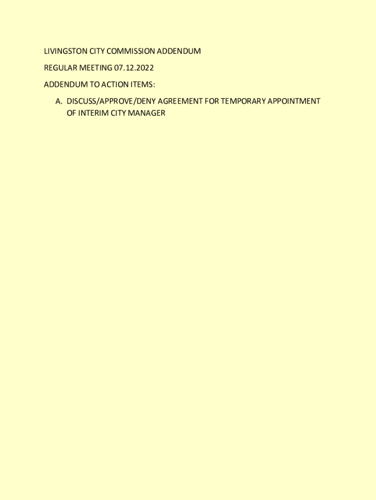 LIVINGSTON CITY COMMISSION ADDENDUM REGULAR MEETING 07.12.2022 ADDENDUM TO ACTION ITEMS: A. DISCUSS/APPROVE/DENY AGREEMENT FOR TEMPORARY APPOINTMENT OF INTERIM CITY MANAGERAGREEMENT REGARDING TEMPORARY