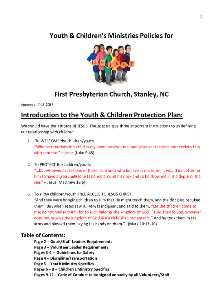 1Youth & Children's Ministries Policies first Presbyterian Church, Stanley, NC Approved: 7132017Introduction to the Youth & Children Protection Plan: We should have the attitude of JESUS. The gospels