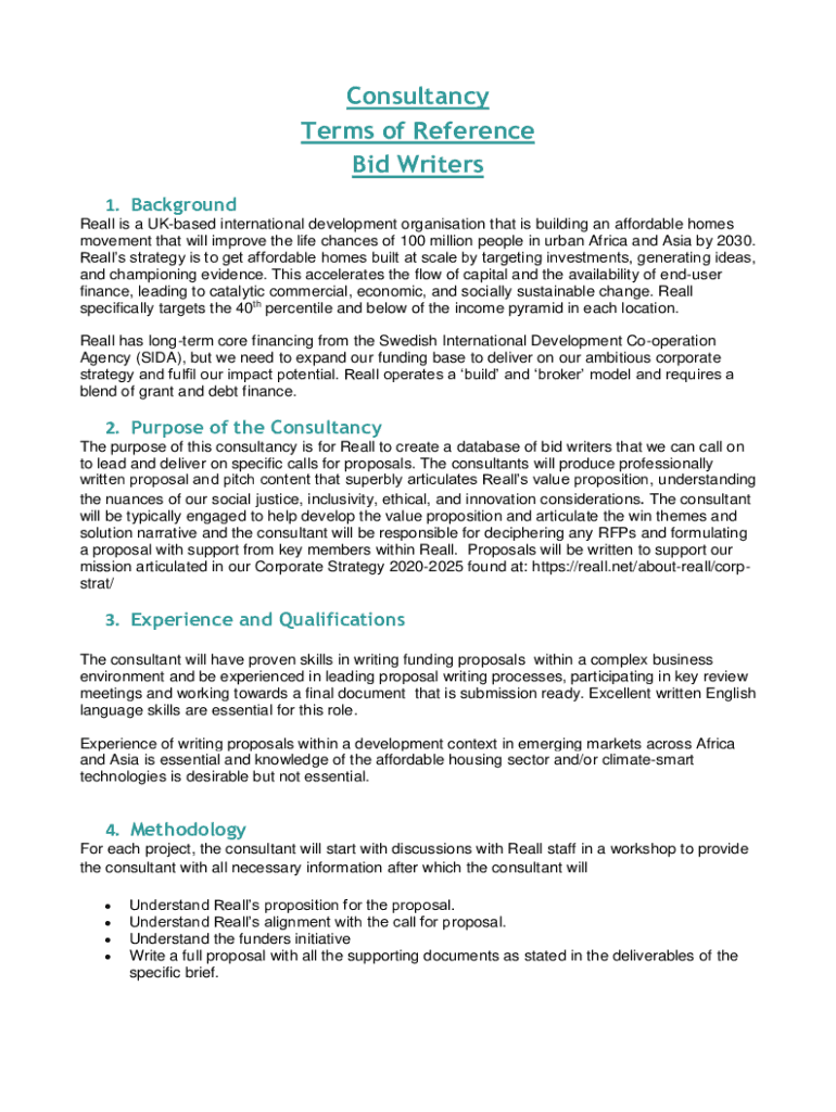 Consultancy Terms of Reference Bid Writers 1. Background Real is a UK based international development organization that is building an affordable homes' movement that will improve the life chances