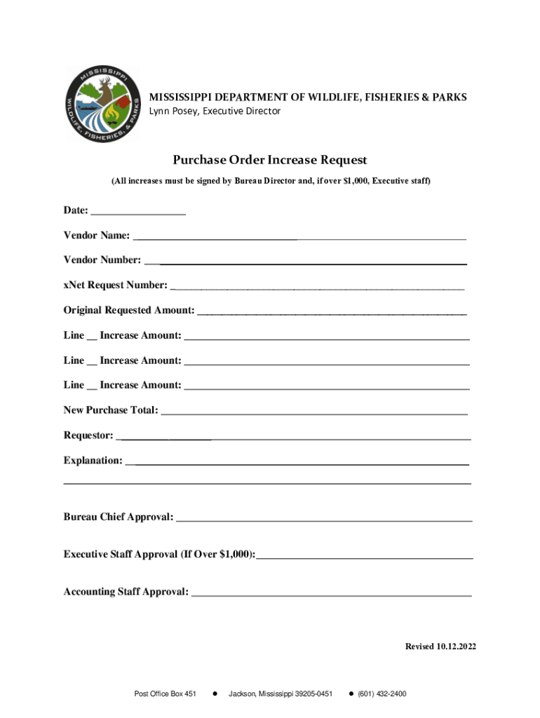 MISSISSIPPI DEPARTMENT OF WILDLIFE, FISHERIES & PARKS Lynn Pose, Executive DirectorPurchase Order Increase Request (All increases must be signed by Bureau Director and, if over $1,000, Executive staff)Date: