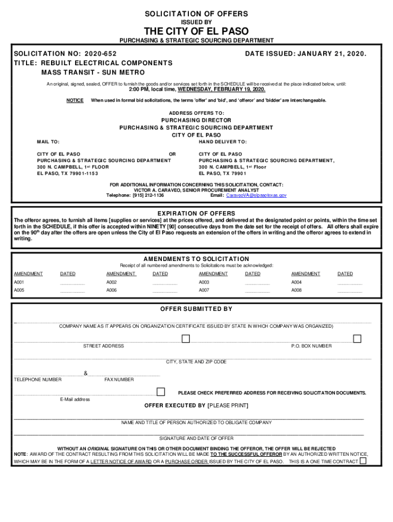 SOLICITATION OF OFFERS ISSUED BYTE CITY OF EL PASO PURCHASING & STRATEGIC SOURCING DEPARTMENTSOLICITATION NO: 2020652 TITLE: REBUILT ELECTRICAL COMPONENTS MASS TRANSIT SUN METRICATE ISSUED: JANUARY