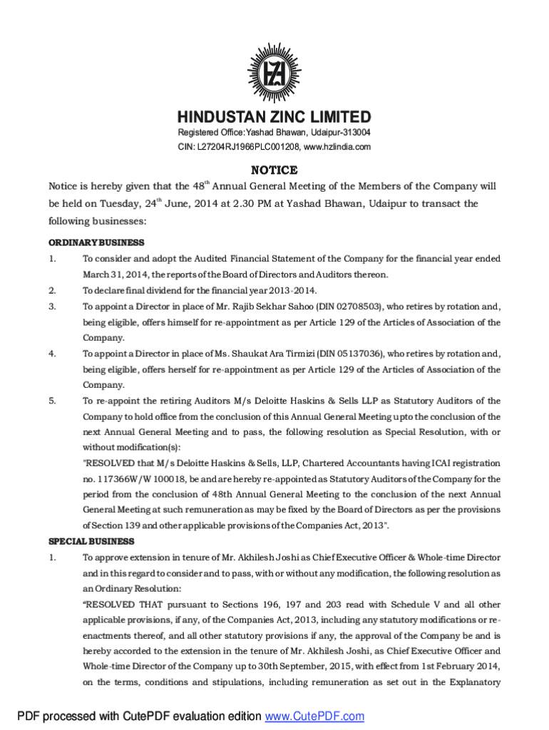 HINDUSTAN ZINC LIMITED Registered Office: Ya shad Shawn, Udaipur313004 IN: L27204RJ1966PLC001208, www.hzlindia.comNOTICE notice is hereby given that the 48 Annual General Meeting of the Members of