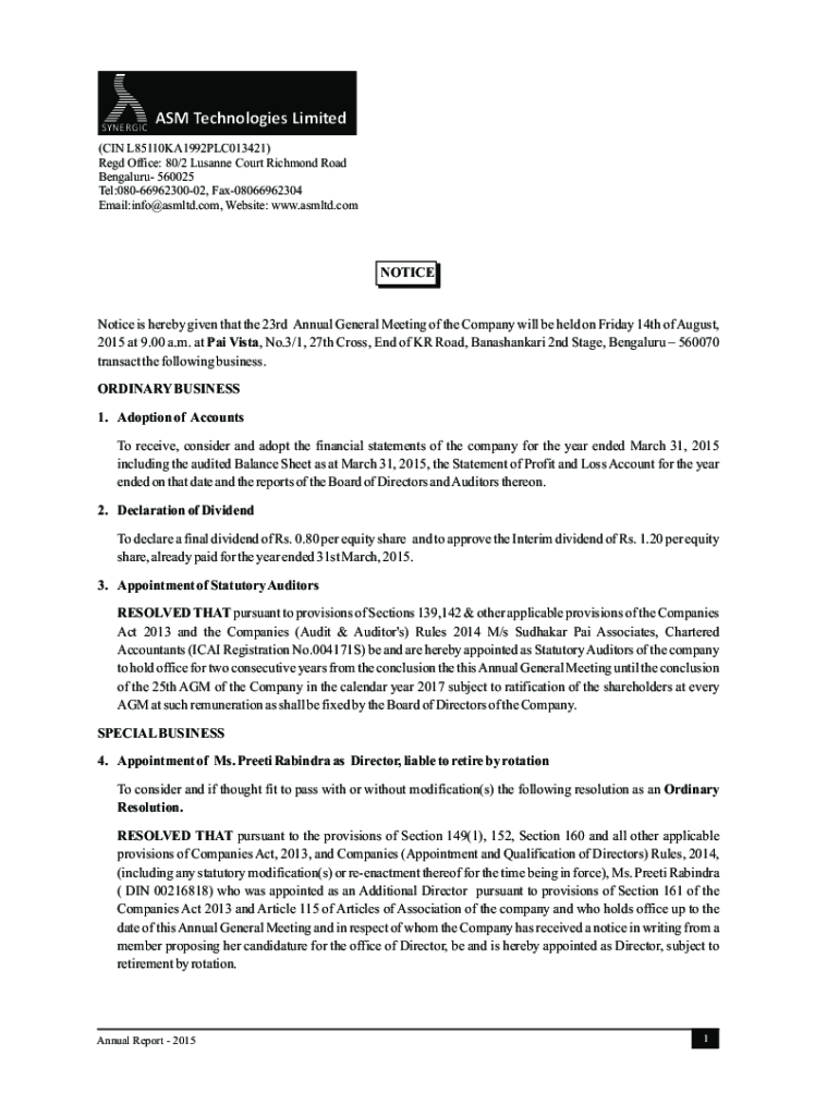 SYNERGISM Technologies Limited(IN L85110KA1992PLC013421) Red Office: 80/2 Susanne Court Richmond Road Bengaluru 560025 Tel:0806696230002, Fax08066962304 Email:info@asmltd.com, Website: www.asmltd.comNOTICE