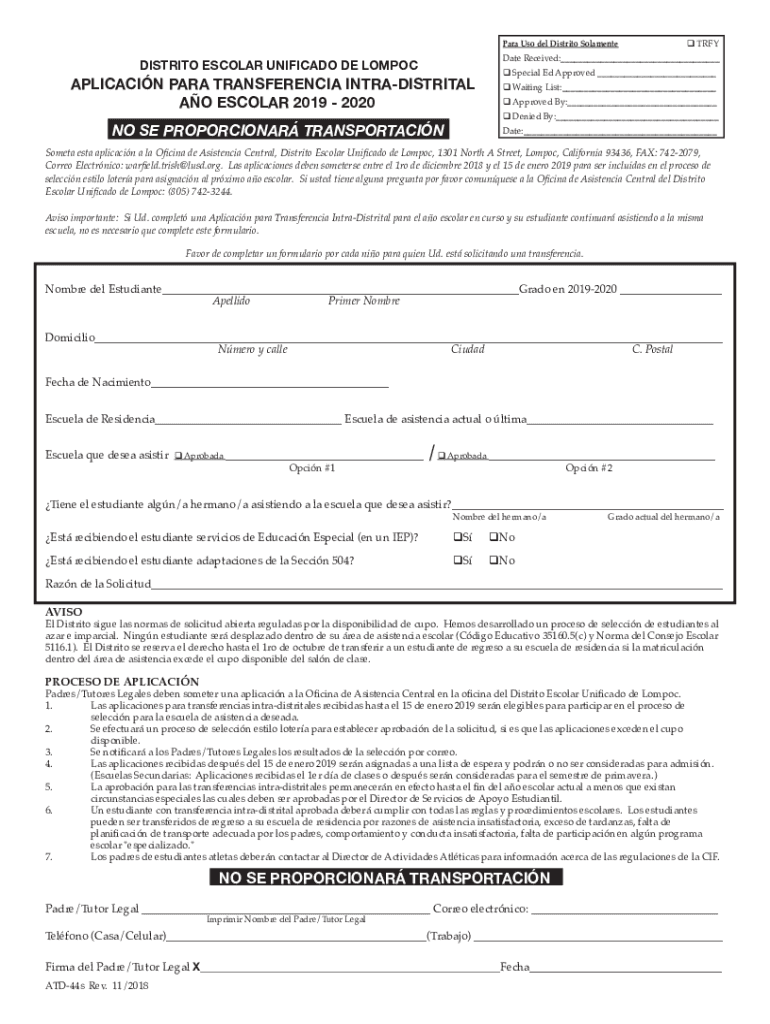 Para USO Del District Solvent Predate Received:___DISTRICT ESCOLAR UNIFIED DE LOMPOCAPLICACIN PARA TRANSFERENCE INTRADISTRITAL AO ESCOLAR 2019 2020 Special Ed Approved ___ Waiting List:___ Approved