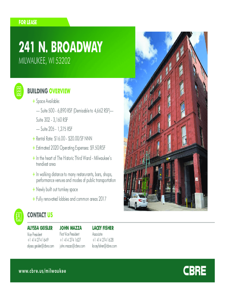 FOR LEASE241 N. BROADWAY MILWAUKEE, WI 53202 BUILDING OVERVIEW + Space Available: Suite 500 6,890 RSF (Desirable to 4,662 RSF) Suite 302 3,160 RSF Suite 205 1,375 RSF + Rental Rate: $$16.0020.00/SF