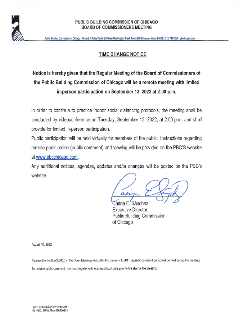 AGENDA REGULAR MEETING OF THE BOARD OF COMMISSIONERS OF THE PUBLIC BUILDING COMMISSION OF CHICAGO TO BE HELD SEPTEMBER 13, 2022, AT 2:00 P.M. OVER A VIRTUAL PLATFORM WITH LIMITED IN PERSON ATTENDANCE