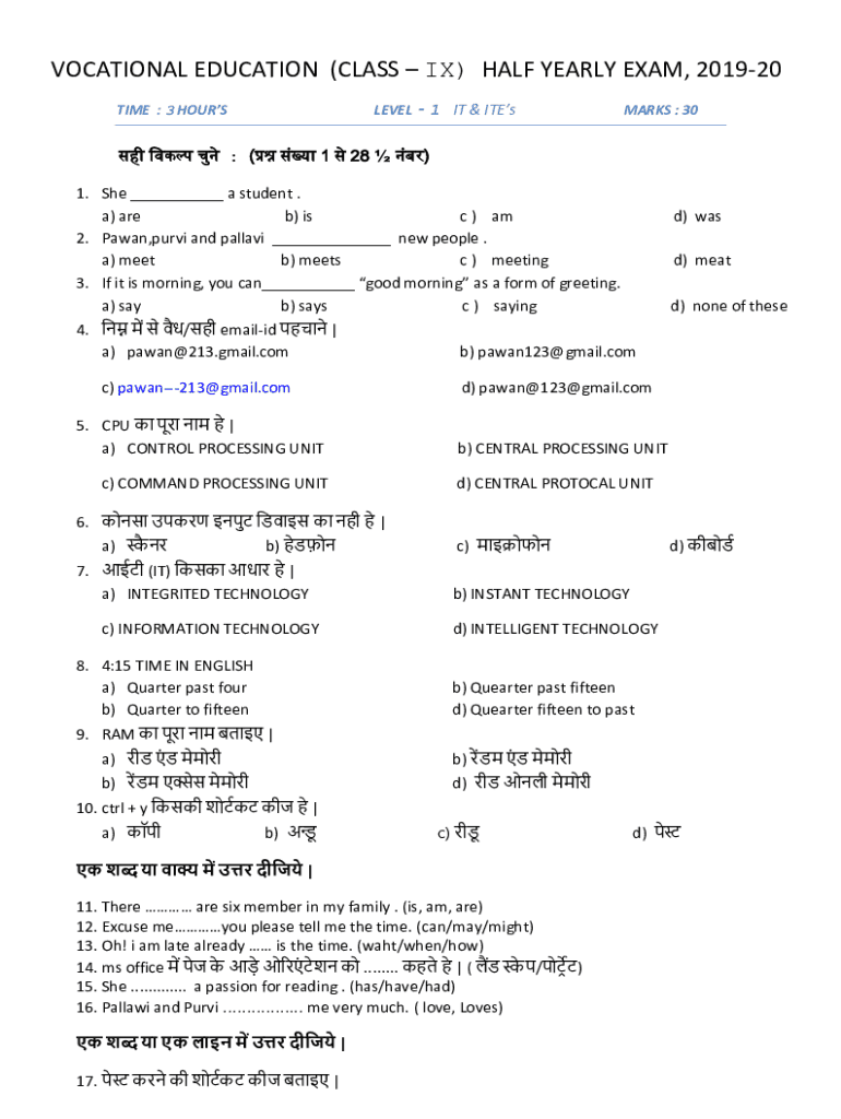 VOCATIONAL EDUCATION (CLASS IX) HALF YEARLY EXAM, 201920 TIME : 3 HOURSLEVEL 1 IT & Remarks : 30 : (1 28) 1. She ___ a student. a) are b) is c) am 2. Pagan, curve and Pahlavi ___ new people. a) meet