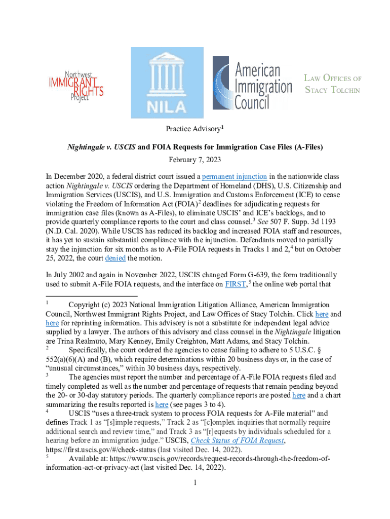 LAW OFFICES OF STACY TOLCHINPractice Advisory 1 Nightingale v. USCIS and FOIA Requests for Immigration Case Files (Files) February 7, 2023, In December 2020, a federal district court issued a permanent