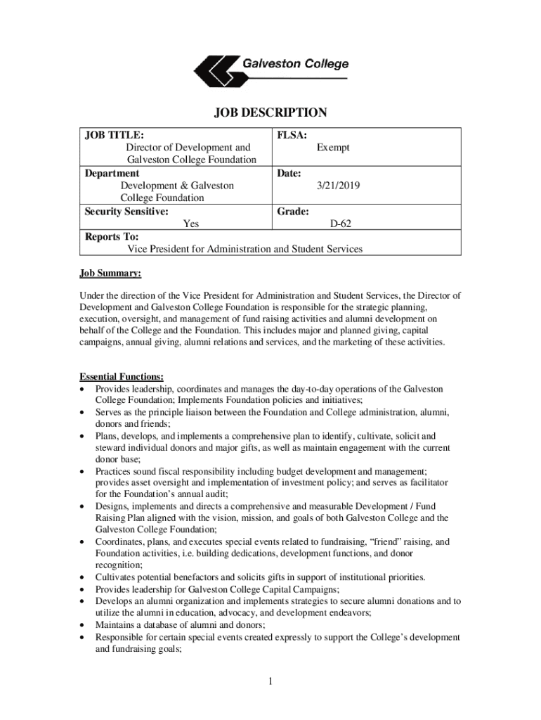 Galveston College DESCRIPTION TITLE: FLEA: Director of Development and Exempt Galveston College Foundation Department Date: Development & Galveston 3/21/2019 College Foundation Security Sensitive: