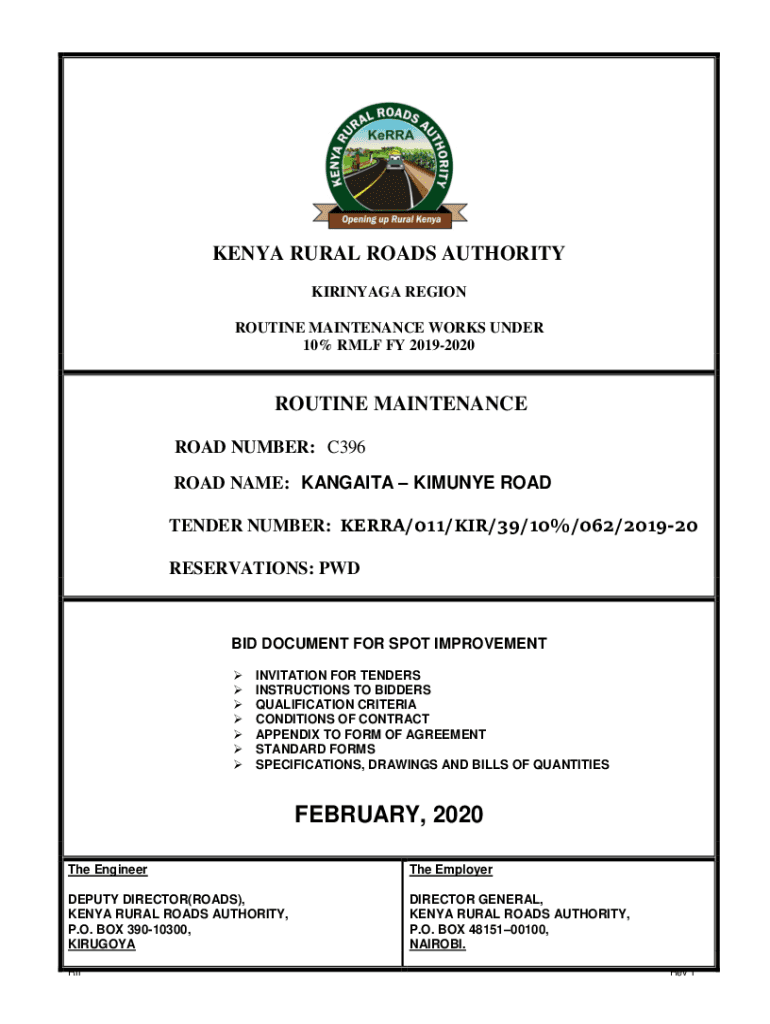 KENYA RURAL ROADS AUTHORITY KIRINYAGA REGION ROUTINE MAINTENANCE WORKS UNDER 10% MLF FY 20192020ROUTINE MAINTENANCE ROAD NUMBER: C396 ROAD NAME: ANITA IMMUNE ROAD TENDER NUMBER: KERRY/011/KIR/39/10%/062/201920
