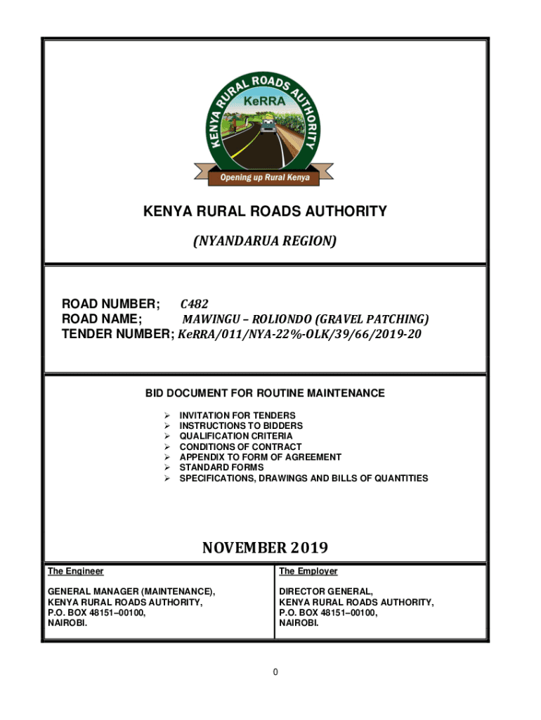 KENYA RURAL ROADS AUTHORITY (NYANDARUA REGION)ROAD NUMBER; C482 ROAD NAME; MAKING ROLANDO (GRAVEL PATCHING) TENDER NUMBER; Kerry/011/NYA22%OLK/39/66/201920BID DOCUMENT FOR ROUTINE MAINTENANCE INVITATION