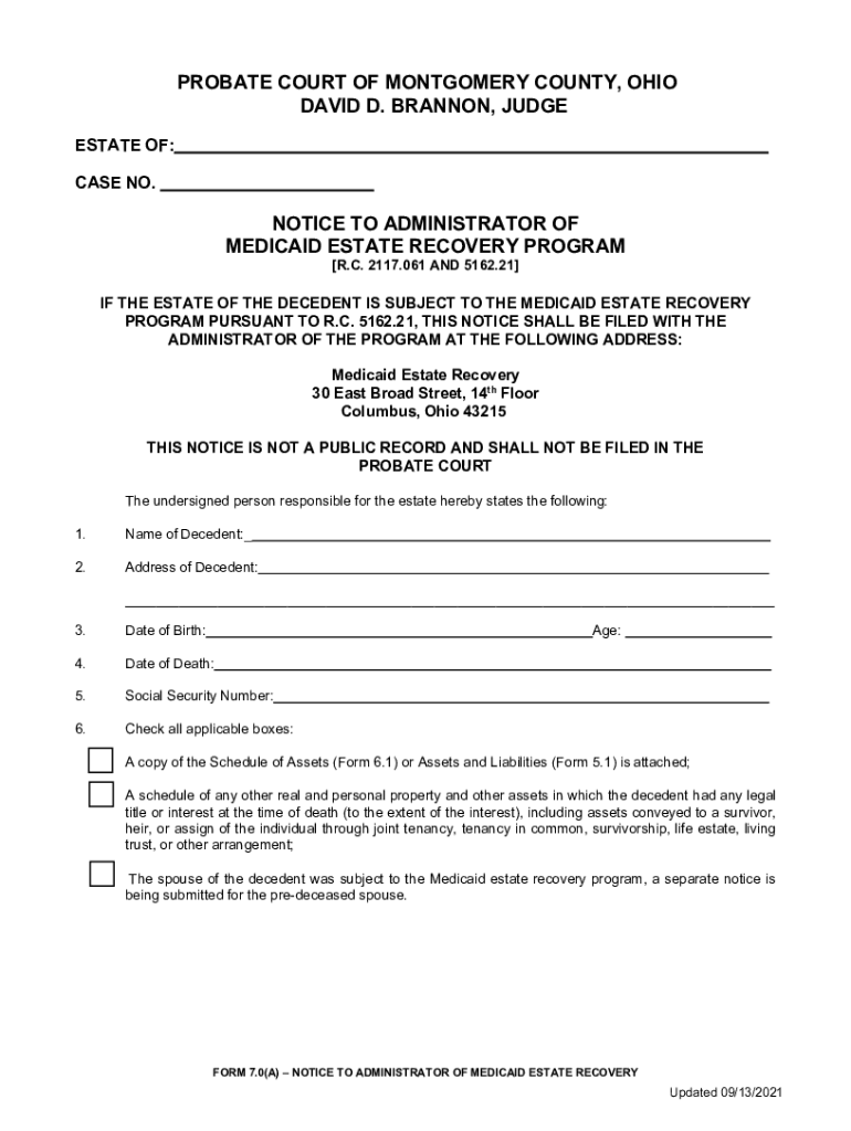 PROBATE COURT OF MONTGOMERY COUNTY, OHIO DAVID D. BRANNON, JUDGE ESTATE OF: CASE NO.NOTICE TO ADMINISTRATOR OF MEDICAID ESTATE RECOVERY PROGRAM [R.C. 2117.061 AND 5162.21]IF THE ESTATE OF THE DECEDENT