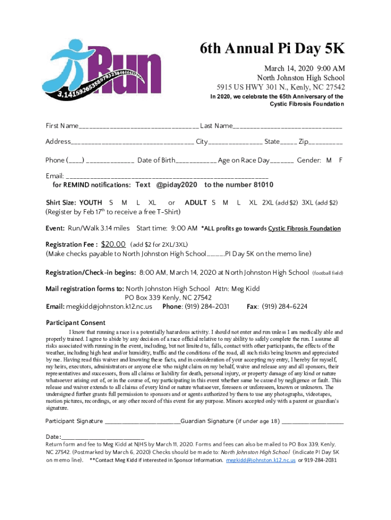 6th Annual Pi Day 5K March 14, 2020 9:00 AM North Johnston High School 5915 US HWY 301 N., Kelly, NC 27542 In 2020, we celebrate the 65th Anniversary of theistic Fibrosis Foundation First Name___