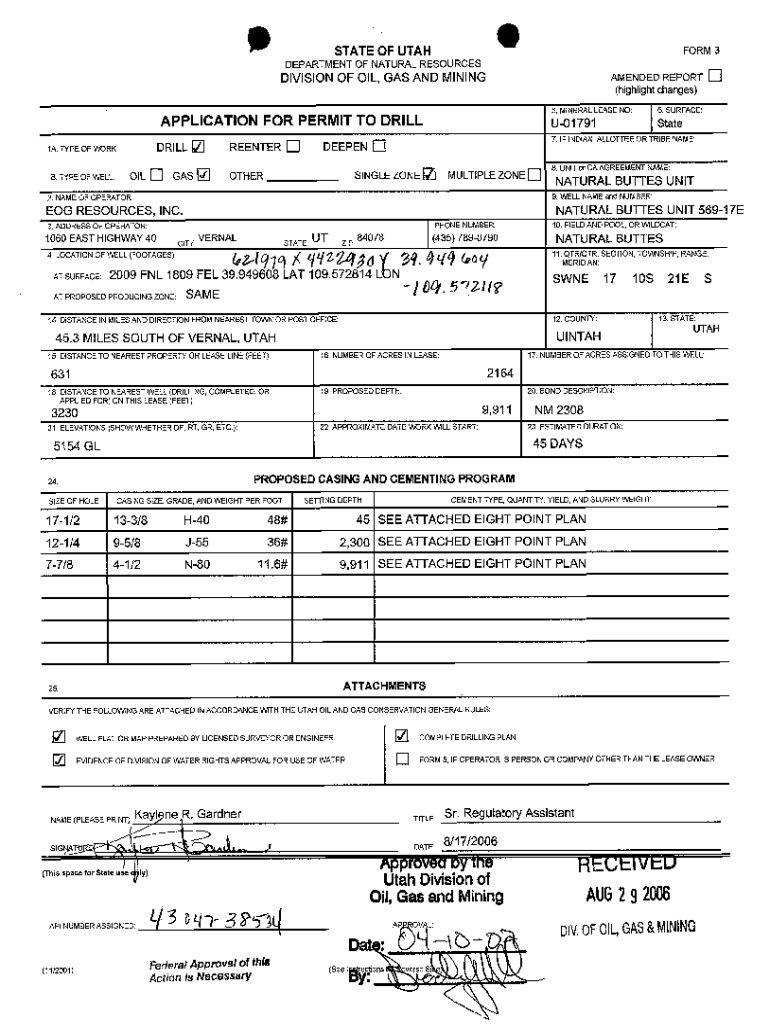 STATE OF PLATFORM 3DEPARTMENT OF NATURALRESOURCESDIVISIONOF OIL, GAS AND MININGAMENDED REPORT (highlight changes)APPLICATION FOR PERMIT Drilling. TYPE OF WELL:OILGASSINGLE ZONEOTHER2MULTIPLEZONEO8.