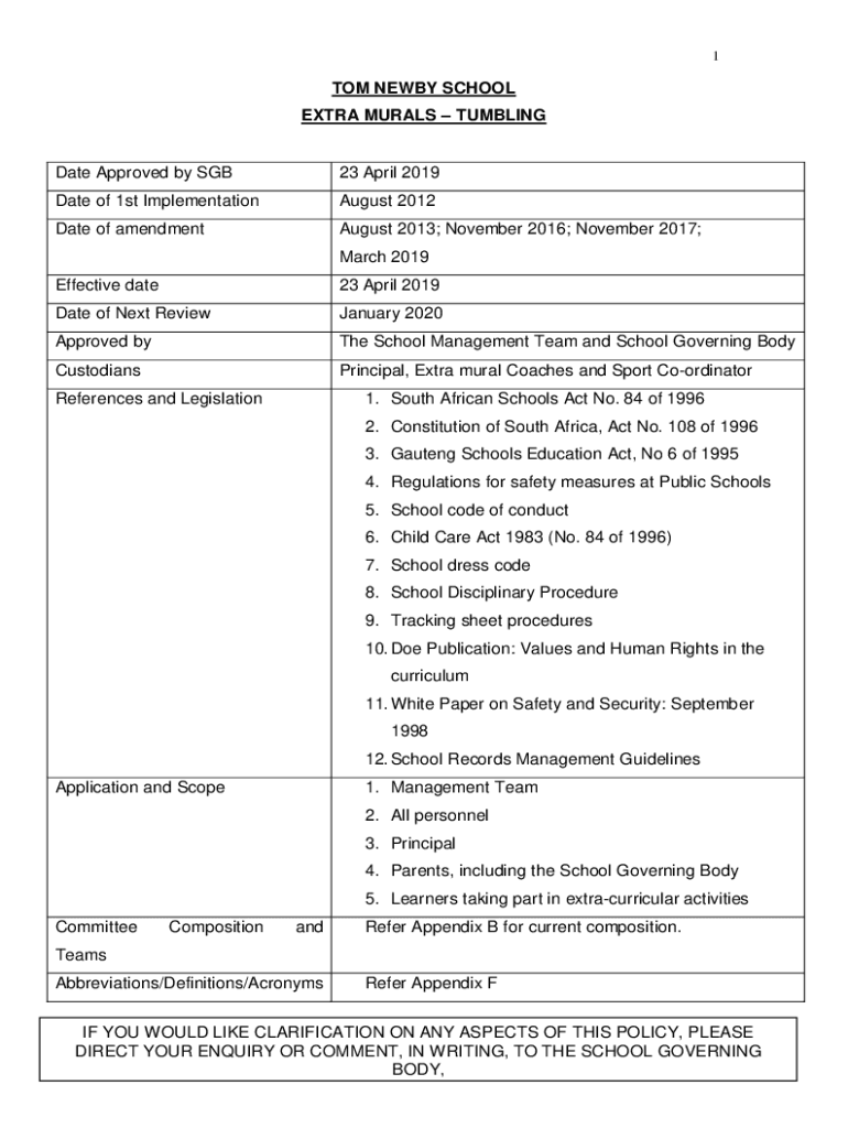1TOM NEWLY SCHOOL EXTRA MURALS TUMBLINGDate Approved by SGB23 April 2019Date of 1st Implementation August 2012Date of amendment August 2013; November 2016; November 2017; March 2019Effective date23