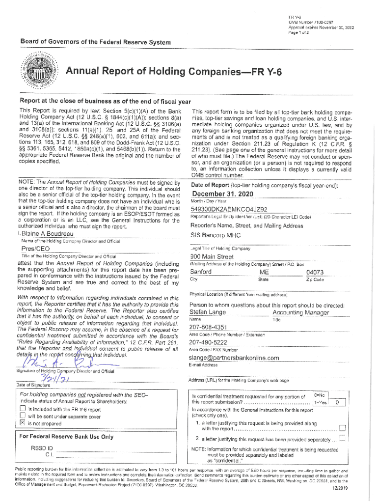 Form FR Y6 SIS Ban corp MHC Sanford, ME Fiscal Year Ending December 31, 2020, March 24, 2021, Federal Reserve Bank of Boston Attn: Stephen Canadian Statistics Unit, Floor T12 600 Atlantic Avenue Boston,