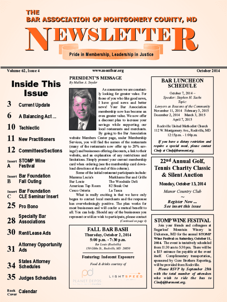 The Bar association of Montgomery County, MDN Volume 62, Issue 4Inside This Issue 3 Current Update 6 A Balancing Acts ... 10 Eclectic 11 New Practitioners 12 Committees/Sections InsertSTOMP Wine FestivalInsertBar