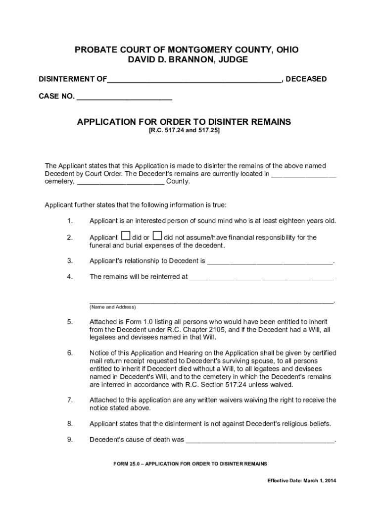 PROBATE COURT OF MONTGOMERY COUNTY, OHIO DAVID D. BRANNON, JUDGE DISINTERMENT OF___, DECEASED CASE NO. ___APPLICATION FOR ORDER TO DISINTER REMAINS [R.C. 517.24 and 517.25]The Applicant states that