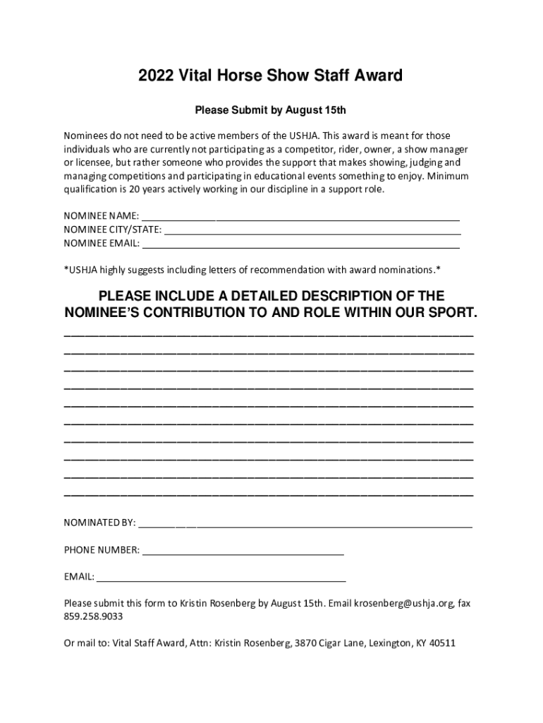 2022 Vital Horse Show Staff Award Please Submit by August 15th Nominees do not need to be active members of the USA. This award is meant for those individuals who are currently not participating as
