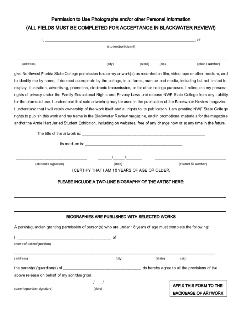 Permission to Use Photographs and/or other Personal Information (ALL FIELDS MUST BE COMPLETED FOR ACCEPTANCE IN BLACKWATER REVIEW!) I, ___, of (student/participant)___ (address)(city)(state)(zip)(phone