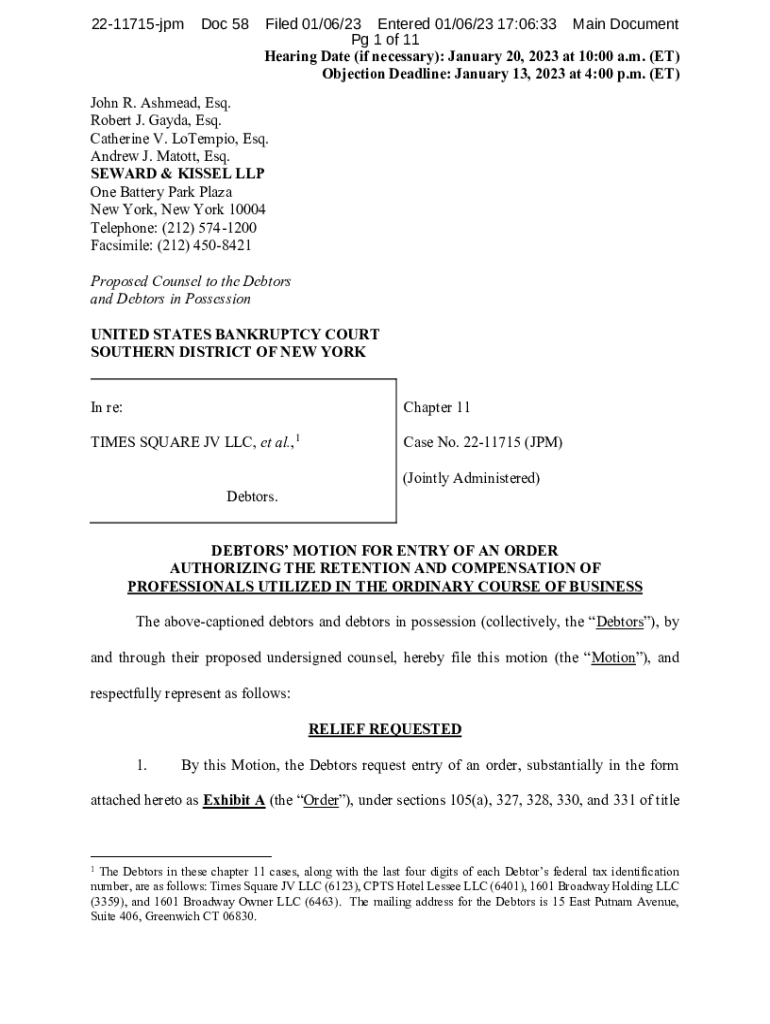 2211715jpmDoc 58Filed 01/06/23 Entered 01/06/23 17:06:33 Main Document Pg 1 of 11 Hearing Date (if necessary): January 20, 2023, at 10:00 a.m. (ET) Objection Deadline: January 13, 2023, at 4:00 p.m.