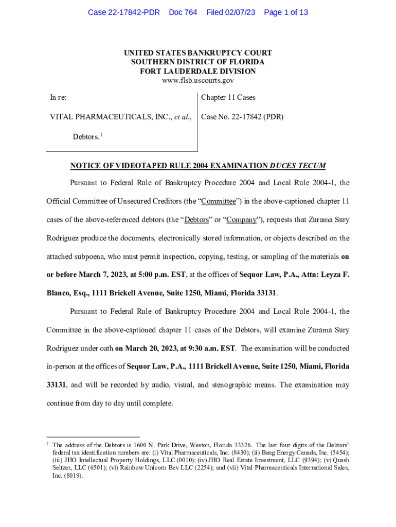 Case 2217842PDRDoc 764Filed 02/07/23Page 1 of 13UNITED STATES BANKRUPTCY COURT SOUTHERN DISTRICT OF FLORIDA FORT LAUDERDALE DIVISION www.flsb.uscourts.gov In re:Chapter 11 CasesVITAL PHARMACEUTICALS,