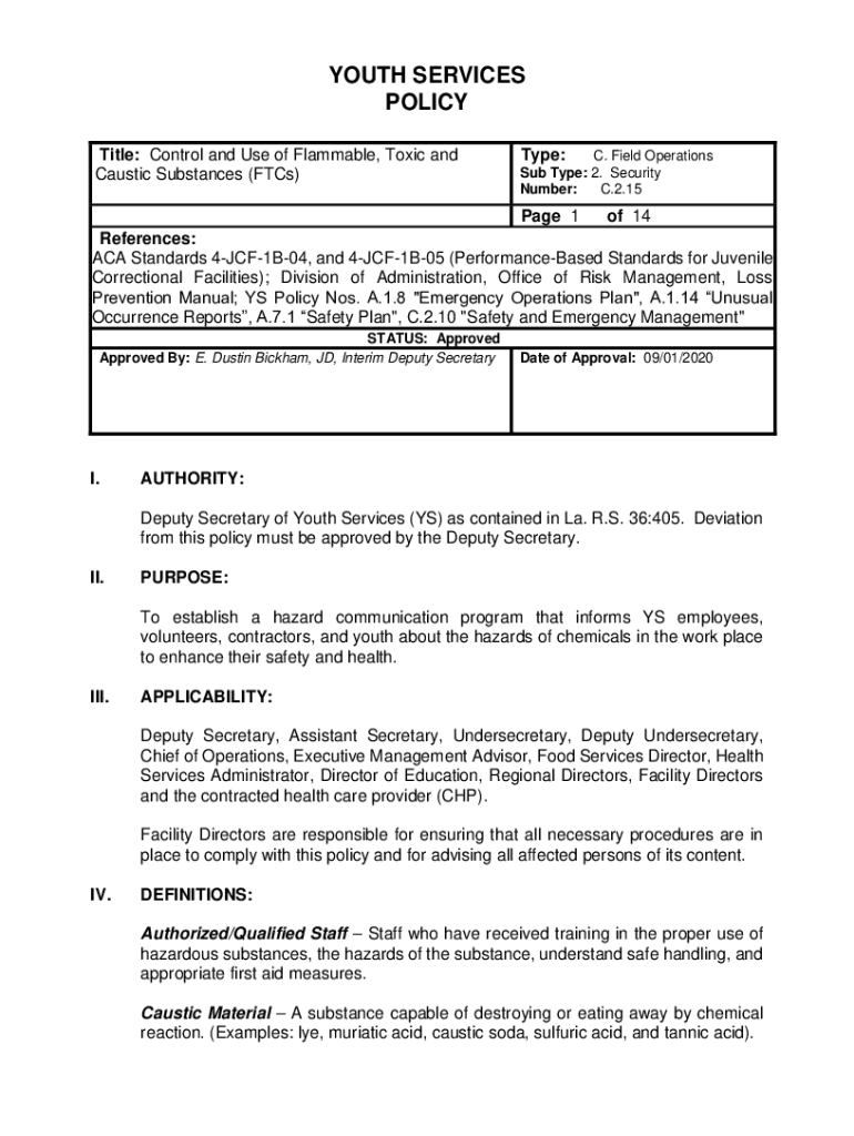 YOUTH SERVICES POLICY Title: Control and Use of Flammable, Toxic and Caustic Substances (FTC's)Type: C. Field Operations Sub Type: 2. Security Number: C.2.15 Page 1of 14References: ACA Standards 4JCF1B04,