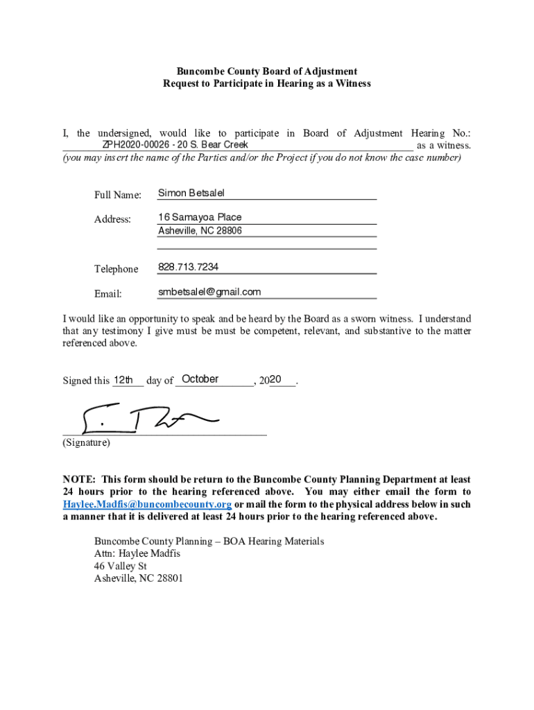 Buncombe County Board of Adjustment Request to Participate in Hearing as a Witness, the undersigned, would like to participate in Board of Adjustment Hearing No.: ZPH202000026 20 S. Bear Creek ___